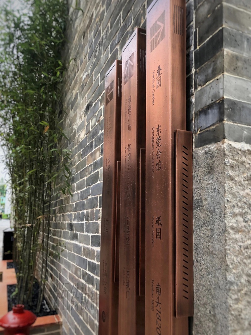 遵從歷史印記,還原本土文化,在導(dǎo)視系統(tǒng)的細(xì)節(jié)表達(dá)上,從粵港文化和民生風(fēng)俗著手,挖掘礎(chǔ)石、門幡等元素特征,結(jié)合自然肌理的石材、手工感的黃銅、傳統(tǒng)豎排文字等細(xì)節(jié),傳遞出年代感、人文感。